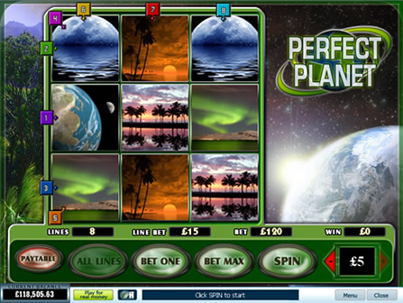 Although technically a three reel online slot machine, the reels all spin independently of each other to allow it to facilitate eight win lines, both aross, up and down and diagonally. The idea of Perfect Planet is to match three symbols on a win line, and depending on which symbols you match, this will determine how much you win.