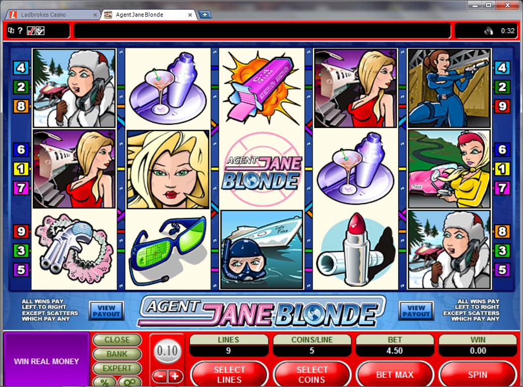 | Agent Jane Blonde Number of Reels: 5 Number of WinLines: 9 Extra Features: Wild Symbol, Scatter Wins, Bonus Rounds |