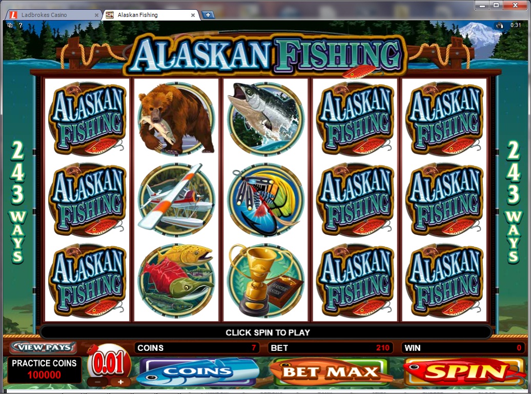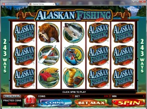 Alaskan Fishing is a themed game that features 5 reels. In order to win, you will have to get symbols on adjacent reels. There are no standard paylines like there are in other slot games. What I enjoy about this game is the betting options. You will be able to wager as little as $0.01 or as much as $0.05 and the bet is for 30 lines. This bet will cover all 243 ways to win. There is a maximum bet on this game of 300 coins per spin, so when playing at $0.05, the wins can be impressive.