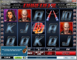 Daredevil is one of the great additions to the slot line-up from Cryptologic. The one thing I loved about this game is that it was one of the Marvel Comic slots. These games all have unique themes that are related to some of the most popular comic heroes of all time. I was impressed with the graphics and sounds in the game. Each spin revealed spectacular symbols that were bright and vivid and the sound effects really enhanced the game. Another thing I enjoyed about playing Daredevil was the opportunity to win one of three great progressive jackpots. Unlike many other video slots available online, the Daredevil game from Cryptologic awards random jackpots. This means that I never had to worry about getting specific wining combinations. With random jackpots, I was able to enjoy the theme of the game and the other features without worrying about placing maximum bets to receive a jackpot award.
