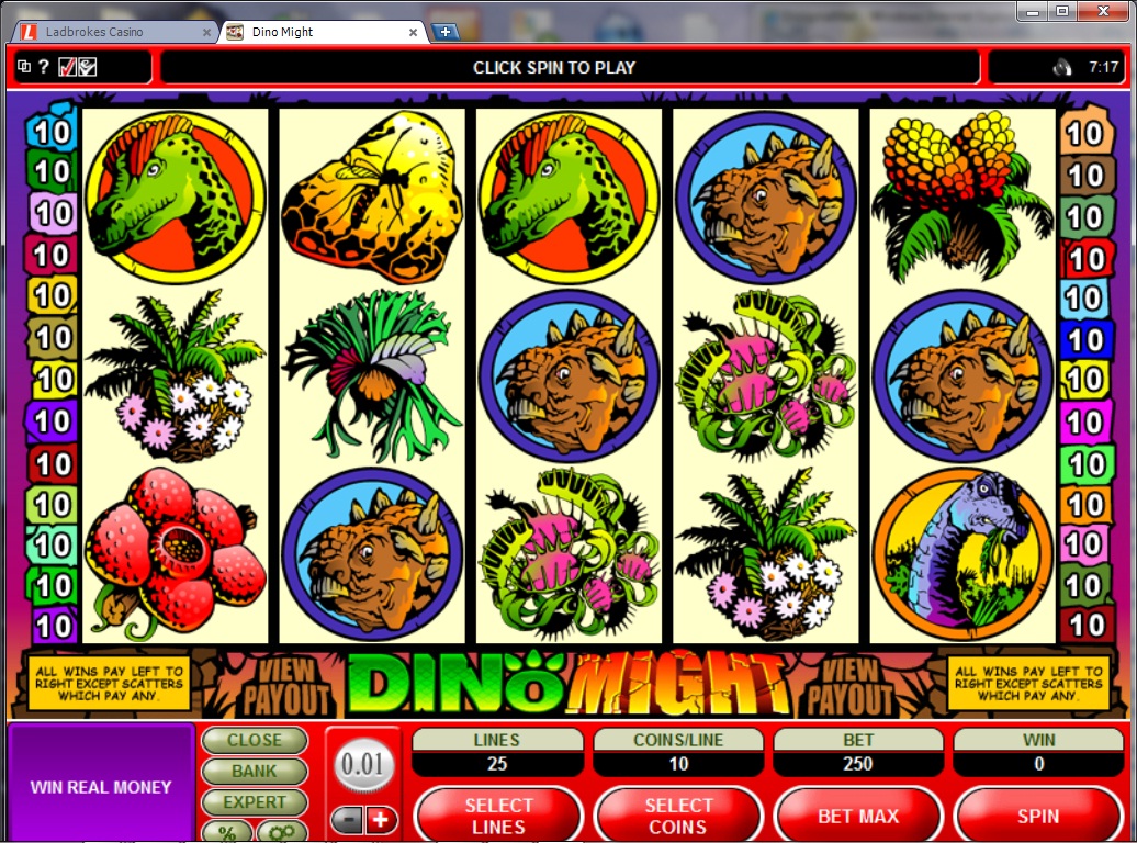 | Dino Might Number of Reels: 5 Number of WinLines: 25 Extra Features: Wild Symbol, Scatter Wins, Bonus Rounds |