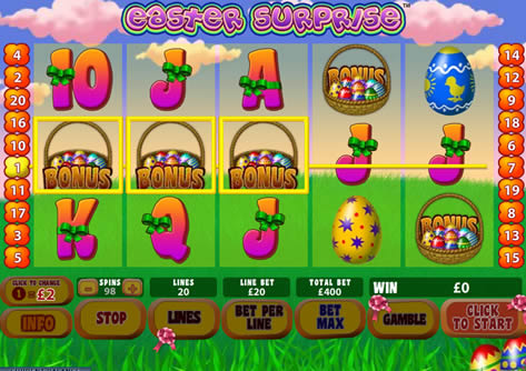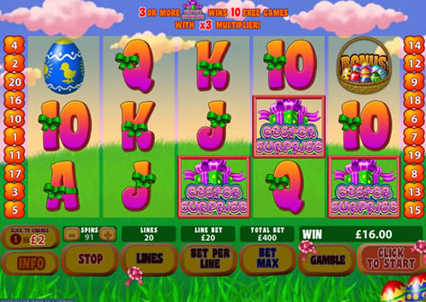 | Easter Surprise Number of Reels: 5 Number of WinLines: 20 Extra Features: Free Spins, Wild Symbol, Bonus Rounds, Scatter Wins. |