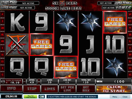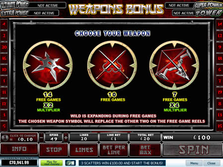 Firstly, the weapon that you chose will be the only weapon that appears on the reels. Where a different weapon symbol would have appeared, you chosen weapon does meaning that there should be a higher chance for you to win. This sounds fine in theory, but as the reels don’t actually change to show you the weapons being substituted you don’t actually feel like you are getting any benefit from this.