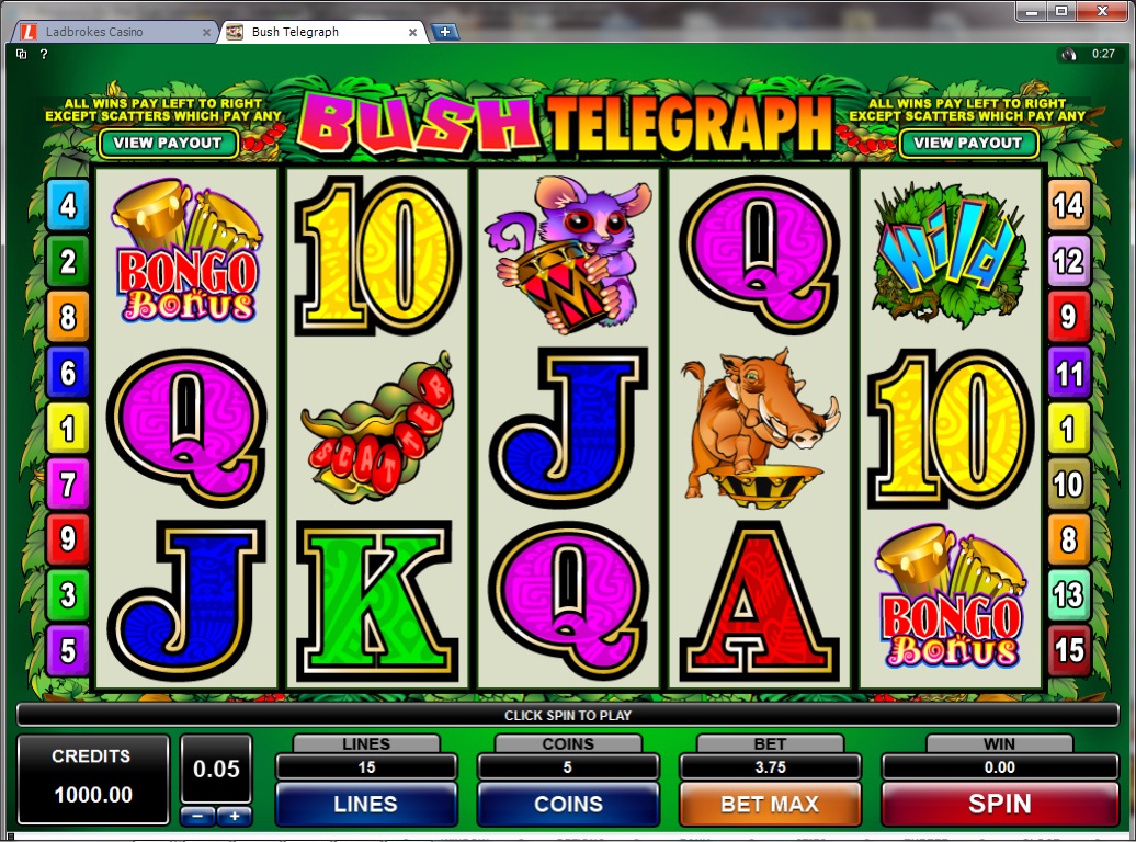 | Bush Telegraph Number of Reels: 5 Number of WinLines: 15 Extra Features: Wild Symbol, Scatter Wins, Bonus Rounds |