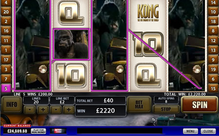If you manage to spin three or more written Kong symbols into any position on the reels then you will initiate the City Tower Bonus and you will be take via a quite long video cut scene showing Kong climbing to the top of the Empire Start Building and being shot at by biplanes.