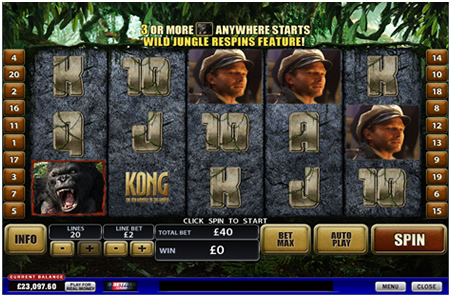 Kong – 8th Wonder of the World is a 5 reel slot playing out over 20 winlines. It looks amazing and the gameplay is smooth, but where this online slot excels is the number of features. A graphic image of King Kong himself is the Wild Symbol, substituting for all other reel symbols except for the written Kong symbol . The graphic Kong symbol helps you get additional line wins in the way that a Wild Symbol does, however if you manage to spin two or more graphic Kong symbols anywhere across the reels you will also win 2x your wager and if you manage to get three or more then you will not only win up to 3000x your line bet, but you will also initiate the Wild Jungle Respins feature.