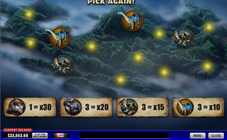 You will be taken via a really nice video cut screen to a map of Skull Island (Skull Island is the home of King Kong in the movie). On the map are a number of areas, and behind each of them is a different dinosaur. Keep clicking on the map areas until you find three of a kind. You will be awarded a multiplier bonus depending on which type of dinosaur you match. You keep selecting until you match three of a kind and then the round ends, your total bonus is revealed and applied to your win bank.
