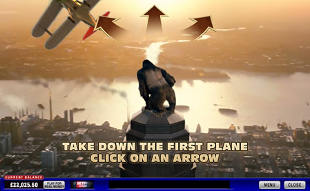 Once at the top the bonus round will start. Biplanes will attack Kong and you have to use your mouse to hit the planes as they fly towards Kong. A successful hit will trigger a cut scene showing the mayhem and damage that you have caused, after which you will return to the bonus round. Each time you hit a biplane you will be allocated a sum of money as a win. You keep attempting to hit the biplanes by moving your mouse around the screen until the round ends.