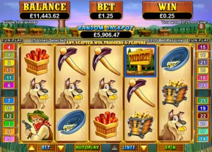 There are also 3 bonus features that can be triggered. If you get three “PayDirt!” symbols spinning in anywhere on the reels (they don’t have to be on a winline) then you will start these features. Clicking on any of the symbols once you have initiated the Bonus Round will reveal which bonus round you will be playing.