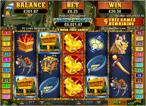 There is also a Random Progressive Jackpot that can be won at any time during your game. This is a great little feature as it means that at any time you could win the jackpot! Progressive Jackpots are built by taking a small amount of your wager for each spin and placing them in a separate pot. The same happens for every player that plays the online slot game and the Progressive Jackpot builds up until it is won. Usually in an online slot game the Progressive Jackpot is won when you get 5 matching symbols of a certain type, but in PayDirt! the Progressive Jackpot is triggered randomly, giving you more excitement as you play.