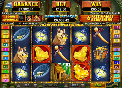 If you pick the Gold Fever Bonus Round then you will get 5 free spins (as opposed to the 12 that you get in the Gold Rush Bonus Round). This might seem a little stingy for an online slot game, but with these Free Spins the third reel is completely wild – it has a Golden Nugget on each position on the reel. This means that getting matching symbols on reels one and two guarantees that you get at least 3 wins for those two symbols (don’t forget that with 25 win lines a lot of them are the same on reels one and two before splitting off over reels 3,4 and 5) AND that all wins are trebled as they use a Wild Symbol!
