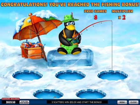 You start with 8 Free Spins, but can then fish for more by choosing which of the ice holes who want to search. Clicking on the ice holes will reel in some more fish, and these will have a bonus attached – either more Free Spins, or a multiplier bonus.