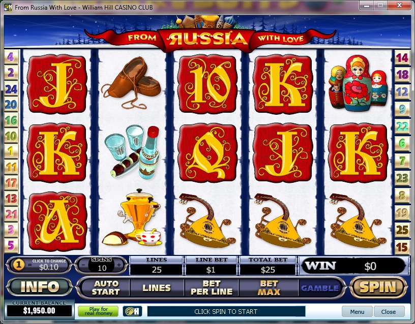 Playing in online casinos is one of my favourite pastimes, especially when I can enjoy some quality slots from Playtech. Playing From Russia with Love provided me with a wonderful gambling experience and I enjoyed some decent payouts with this game. With the lack of a progressive jackpot, the game does make up for this shortcoming by offering a top fixed jackpot amount of 10,000 coins. There is also a nice bonus round that added a good amount to my bankroll. This game is a five reel slot featuring 25 lines of action. With the ability to bet between $0.01 and $0.10 per payline and as many as 250 coins on a single spin, the betting options are great, making this a perfect game for beginners as well as high rollers.
