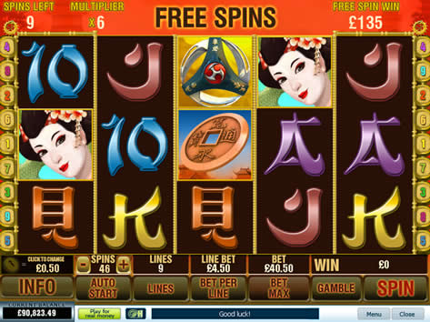The Geisha Girl symbol works on a Scatter Win basis. Unlike the other line wins where you have to match the symbols on a win line, Scatter Wins are paid out for getting the symbol anywhere on the reels. Getting 3 Geisha Girl symbols will win you 5x your line bet, 4 will get you 25x your line bet and if you manage to get 5 Scatter symbols then you will get a massive 100x your line bet.