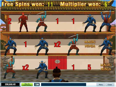 The ninjas prize will either be a win multiplier, or a number. The numbers add up to the total number of Free Spins that you can get and the multipliers are also added up to give you your final Free Spin Multiplier bonus. In the free spins round you can get up to an 8x multiplier for each spin.