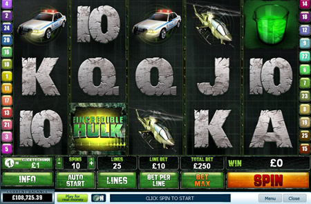 The Incredible Hulk is one of a series of Marvel superhero themed slots developed by Playtech for licence in many online casinos across the globe. The action takes place across 5 reels and 25 pay lines, and apart from the symbol matching element of the game, offers a bonus round, a free spins round, and a Wild symbol all engineered to help you win big!