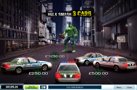 Three helicopters will then drop into the screen. Click on one and Hulk will destroy that too to reveal your multiplier bonus. The multiplier bonus is applied to your bonus round win to give you the final amount that you have accumulated.