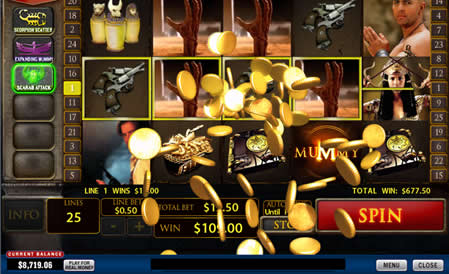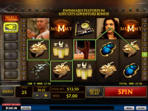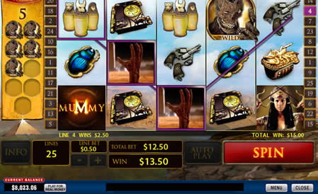 | The Mummy Number of Reels: 5 Number of WinLines: 25 Extra Features: Wild Symbol, Free Spins, Scatter Wins, 2x Bonus Rounds, Collapsing Reels, Multiple Features, Multiplier wins. |