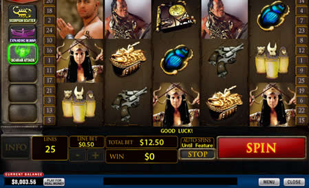 - 3. Scarab Attack – if you choose this feature and the Mummy appears on any position on Reel 3 then a swarm of Scarab beetles will come out from behind the reel and turn two more reels Wild; one on Reel 2 and one of Reel 4 meand that you will have a Wild symbol on Reels 2,3 and 4. Again, very handy for generating multiple line wins, and also guaranteeing you a number of four-of-a-kind wins.