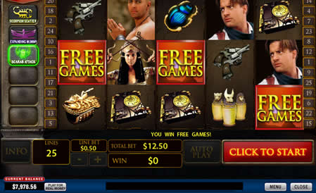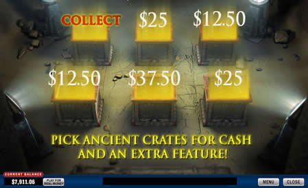This feature is triggered randomly as you play. When it starts, a nice little video cut scene from the 1999 movie will play and you will then be taken to a new screen with 6 chests. If you’ve played anything like Desert Treasure, Cleopatra or a host of other online slot games then you will know what to expect next. Click on the chests to reveal money – keep clicking until you land on the “Collect” button; your round will finish and all the values are added together to give you a win.
