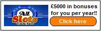 - All Slots – Get £/$/E5000 in bonuses over the year! - This is a big bonus – sign up as a real player with All Slots Casino and not only will they give you a 100% cash match deposit bonus in whichever currency you are playing in, but they will also give you a 10% bonus on all future deposits too! Click here to visit All Slots Casino now!