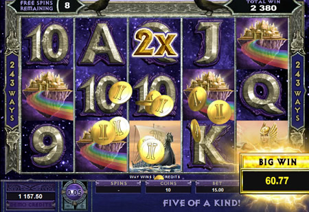 Your free spins work in the usual way. However at the top of the screen are two black ravens. When you spin in a win, one or both of these ravens will fly around the screen and eventually fly into a reel symbol. This symbol will become either a 2x or 3x bonus multiplier, which is pretty cool. Whats cooler though is that these symbols also become Wilds, giving you the potential to generate multiple online slot wins at either a 2x,3x,5x or 6x multiple. As you can see from the screenshot, its a great way to earn big wins!
