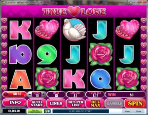 If you are a hopeless romantic like I am and love bonus round slot games, True Love is the game to play. This video slot offers the perfect theme for Valentine’s Day all presented in various shades of red and pink. This game will surely get your heart pumping as it offers some amazing payouts, added features and endless entertainment. The game features 15 exciting paylines. One of the benefits of playing True Love is that you will have the ability to select a coin size in your preferred currency. With 8 different con sizes and the option to bet as many as 10 coins on each line, you will have the chance to increase or decrease the amount of the bet at any time.